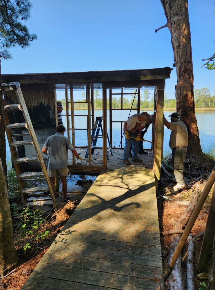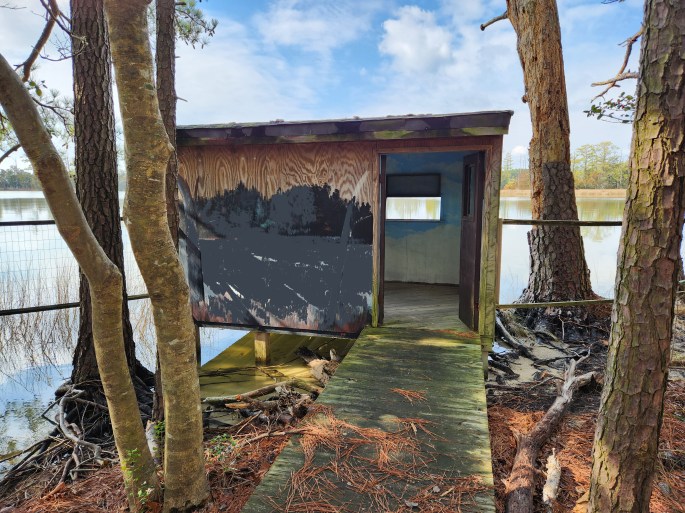 Looking for ways to improve visitor experience at Belle Isle and inspired by the Virginia Wildlife Viewing Plan 2021-2031, in late 2023 the Friends and Jon Steele, Park Manager, considered the possibility of adding a new wildlife viewing station. It would be terrific to have one but we quickly realized that the rigors of regulatory compliance and major construction were a bit too much for a group inexperienced in such matters. Jon called out attention to an ageing photography blind just off the Porpoise Creek Trail on an inlet from the Rappahannock.
