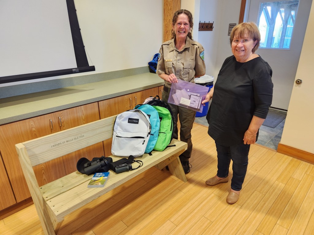 At the October Friend’s meeting, the backpacks, equipment, and benches were presented by Frances Callaghan, Friends President, to Rachel Howell, the parks education Ranger.