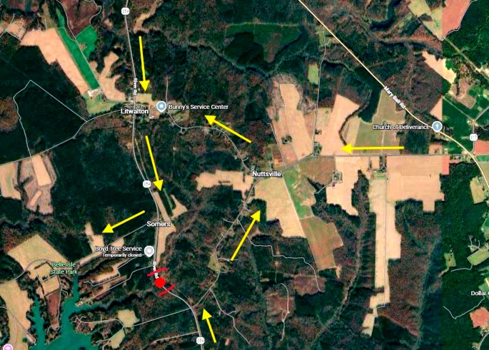 If you are headed north to the park on River Road from south of St Mary’s (Rte. 201), you will need to take Nuttsville Road (Rte.618) to Morattico Road (Rte 622), turn back to River Road and then left to Belle Isle Road.